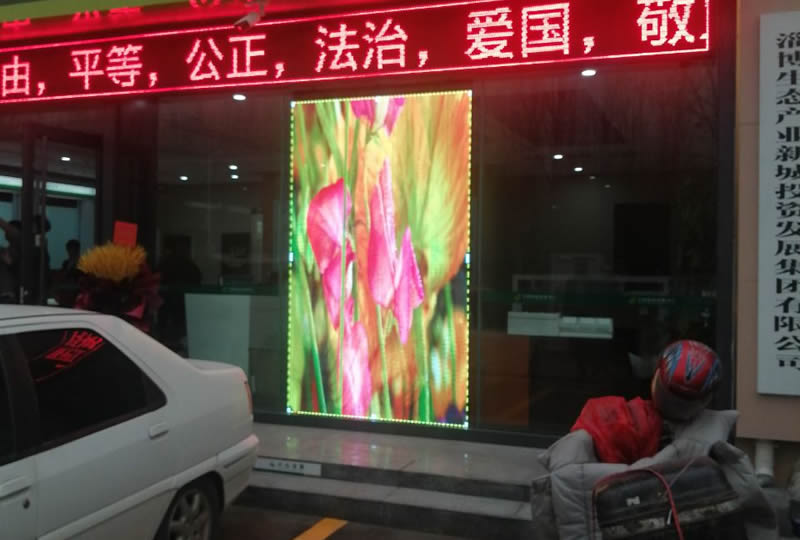 本案例中,維康國際為淄博市某郵政銀行提高一套室內LED透明柵欄屏,如上圖所示,外面顯示清晰,從里面看半透明狀態(tài)。