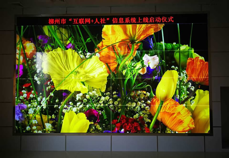維康國際為柳州人社局提供的這套顯示大屏,是4x4拼接、55寸電子無縫拼接屏。
