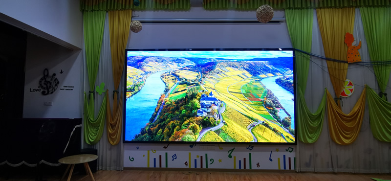 本案例中,維康國際為東莞市某幼兒園提供一套高清LED大屏,采用P1.86小間距LED系列,顯示面積約10平方米,大屏幕顯示清晰,一體化效果好。