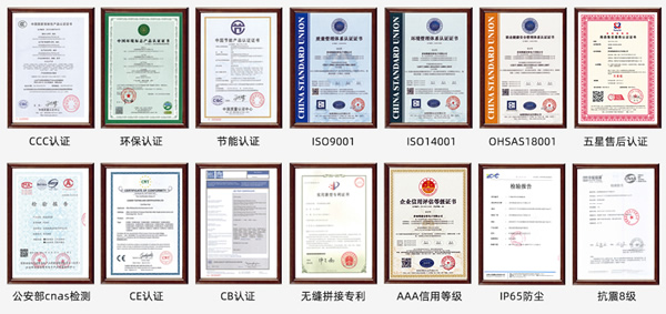 ISO9001、ISO14001、OHSAS18001、3C、節(jié)能認(rèn)證、環(huán)保認(rèn)證、公安部檢測報告、防塵、CE、CB、FCC、ROHS、外觀專利、大屏軟件專利等。