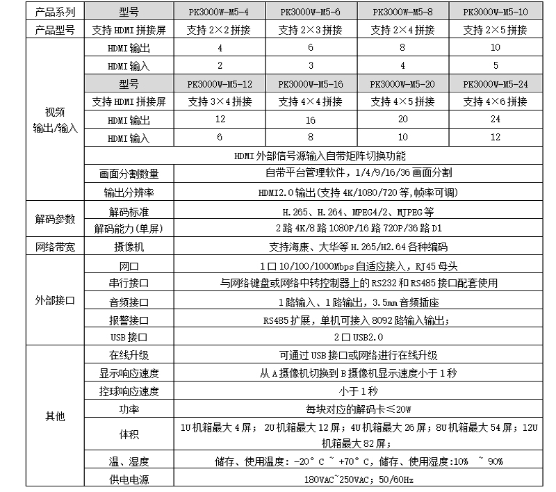 PK3000W-M5數(shù)字矩陣采用最新的安防專用編解碼芯片,專為H.265標(biāo)準(zhǔn)及4K超高清編解碼而設(shè)計,產(chǎn)品采用嵌入式LINUX架構(gòu),保障系統(tǒng)的穩(wěn)定運行,采用模塊化設(shè)計,可以在大型、超大型數(shù)字安防監(jiān)控系統(tǒng)中實現(xiàn)解碼、編碼、拼接、分割、畫中畫、漫游等功能,為工程項目最大程序解決大數(shù)據(jù)數(shù)字化監(jiān)控系統(tǒng)提供解碼上墻及多信號輸入編碼等提供一站式解決方案;設(shè)備采用全鋁標(biāo)準(zhǔn)機箱,結(jié)構(gòu)上大氣美觀可靠,散熱性結(jié)構(gòu)化好。