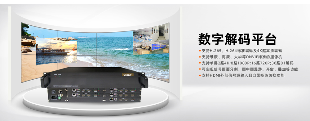 支持H.265 Main Profile Level5.1、H.264 Baseline/Main/High Profile Level5.0、MPEG4 SPL0~L3/ASP L0-L5、MJPEG、JPEG Baseline解碼。支持單屏2路4K;8路1080P;16路720P;36路D1視頻解碼。