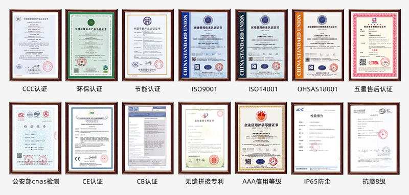 維康國(guó)際通過了ISO9001質(zhì)量管理體系、ISO14001、OHSAS18001、3C、節(jié)能認(rèn)證、環(huán)保認(rèn)證、公安部cnas檢測(cè)報(bào)告、抗震8級(jí)、防塵、CE、CB、FCC、ROHS、外觀專利、大屏軟件專利等,在支持客戶參與招投標(biāo)項(xiàng)目中有很大優(yōu)勢(shì)。