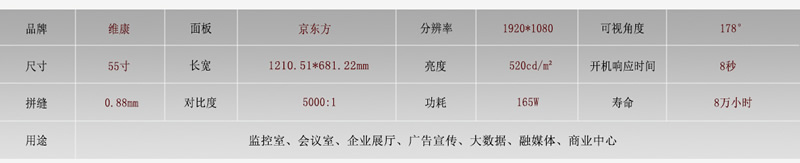 京東方簡(jiǎn)稱BOE,是知名的液晶面板制造商,提供大尺寸液晶面板、小尺寸手機(jī)屏等,在液晶拼接屏產(chǎn)品線中,尺寸及拼縫規(guī)格齊全。面板采用16:9比例,低能耗,待機(jī)功率只有0.5W。