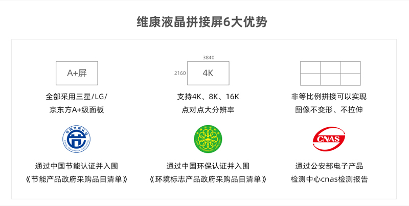 維康國(guó)際通過(guò)了ISO9001質(zhì)量管理體系、ISO14001、OHSAS18001、3C、節(jié)能認(rèn)證、環(huán)保認(rèn)證、公安部cnas檢測(cè)報(bào)告、抗震8級(jí)、防塵、CE、CB、FCC、ROHS、外觀專利、大屏軟件專利等,在支持客戶參與招投標(biāo)項(xiàng)目中有很大優(yōu)勢(shì)。